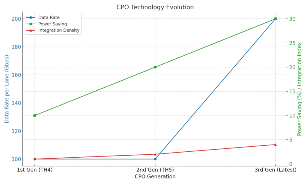 隨著人工智慧與高效能運算(HPC)對資料傳輸速度與能效要求日益提高,共封裝光學(Co-Packaged Optics, CPO)技術可望成為資料中心互連架構的核心。2025 年,博通(Broadcom)正式推出第三代 CPO 平台,實現每通道 200G 的傳輸速率,並同步宣布正開發第四代 400G/lane 解決方案。此一發表不僅代表技術層級的重大突破,也標誌 CPO 進入了可規模部署與系統整合的新階段。
