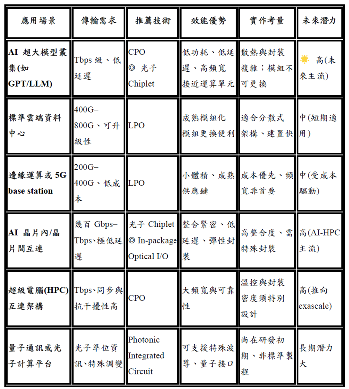 以下比較 CPO、LPO、Photonic Chiplet/In-package Optics(光子晶粒/封裝內光學) 的技術適用性、效能與投資考量。