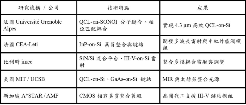 在美國麻省理工學院(MIT)與加州大學聖塔芭芭拉分校(UCSB)長期合作 III-V-on-Silicon技術開發,並在中紅外(MIR)與太赫茲(THz)領域取得顯著成果。UCSB實現了InAs/InP QCL on Si雷射鍵結節;MIT則在GaAs-on-Si混合平台上開發量子光學元件整合研究。兩校的研究成果揭示了異質整合不僅延伸了矽光子平台,更為未來的量子光子系統(Quantum Photonic Systems)與全光運算架構奠定基礎。