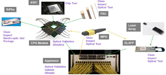 然而,矽光子與CPO真正困難的地方,往往不是概念,而是現場實作。在CPO生態系中,從矽光子晶片(SiPh)、ASIC、光纖陣列單元(FAU)、雷射陣列、ELSFP 光源模組、MPO連接器,一直到CPO模組與最終設備,每一個節點都需要被測試。