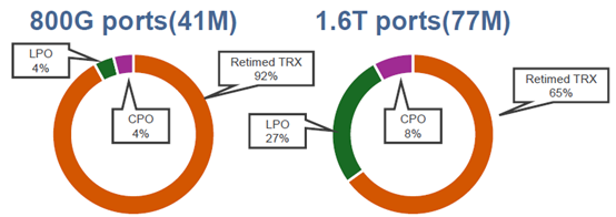 針對800G、1.6T與3.2T乙太網路收發器埠數的出貨構成:在800G時代,Retimed可插拔模組仍佔壓倒性多數,LPO 與CPO僅扮演少數角色;到了 1.6T,LPO 比重明顯升高,而CPO開始佔有可觀但仍相對有限的比例;真正明顯翻轉出現在3.2T世代,CPO在預測中上升為主角之一,Retimed與LPO則相對退居次要,如圖2所示。